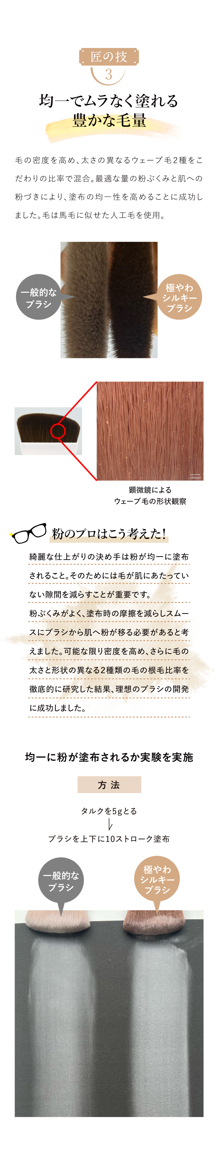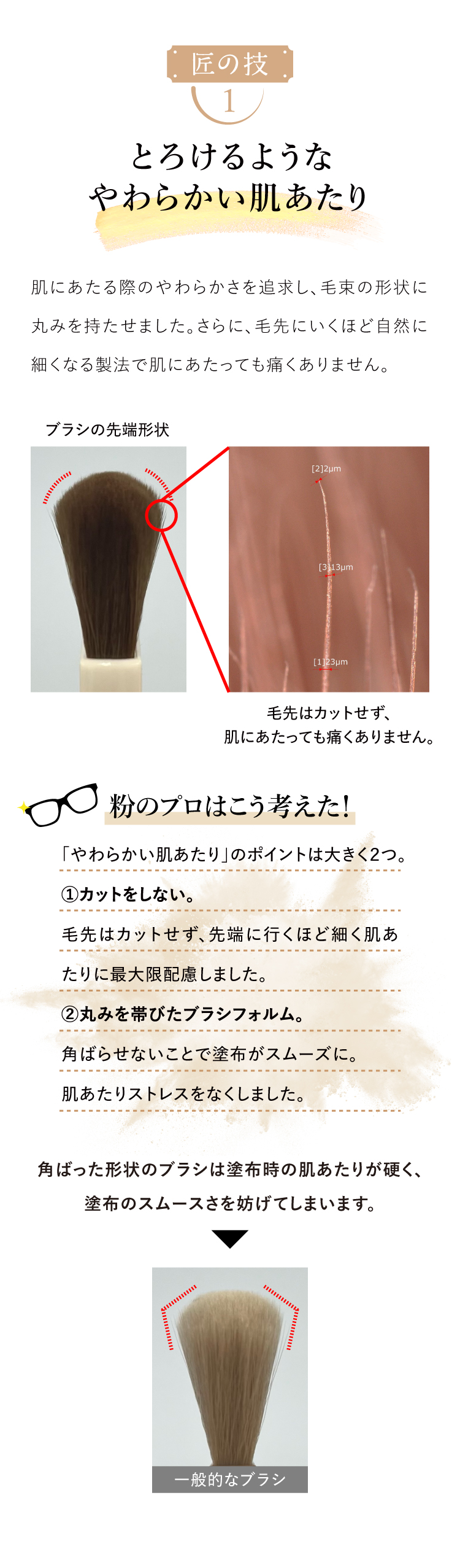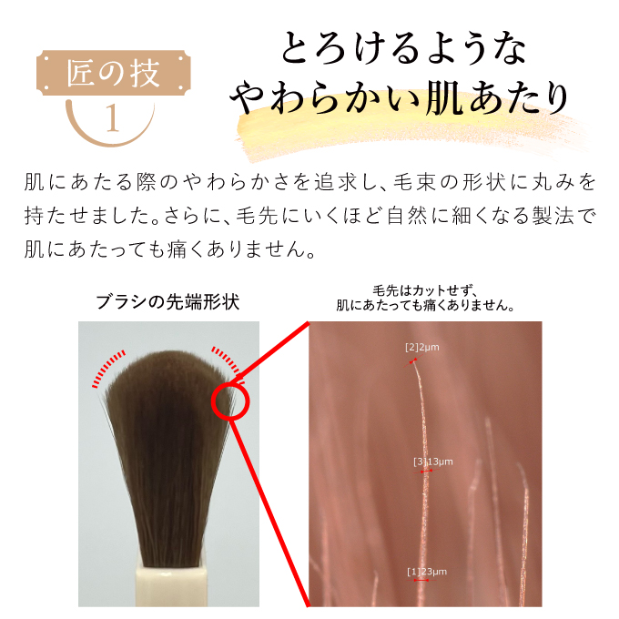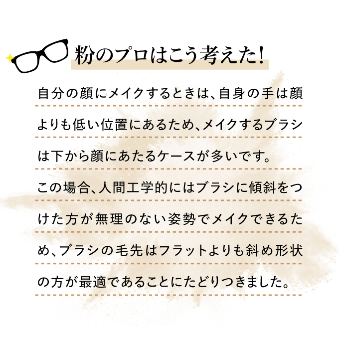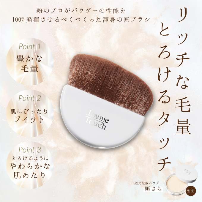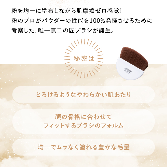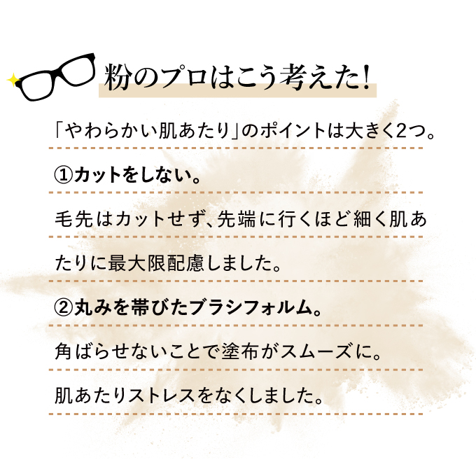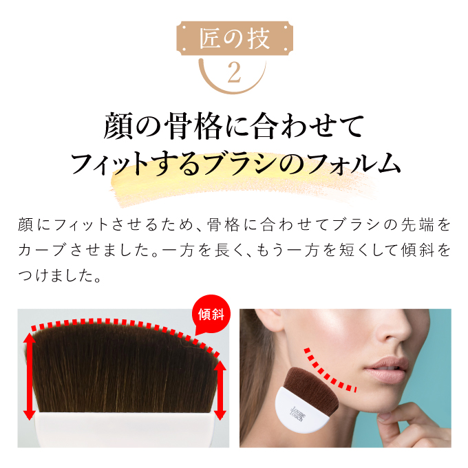 | 特徴 | 粉のプロがパウダーの性能を100%発揮させるべく、本気で作った唯一無二のブラシ。 豊かな毛量でとろけるようなやわらかい肌あたりが特徴。 骨格に合わせてぴったりとフィットし、均一でムラのない仕上がりに導きます。 |