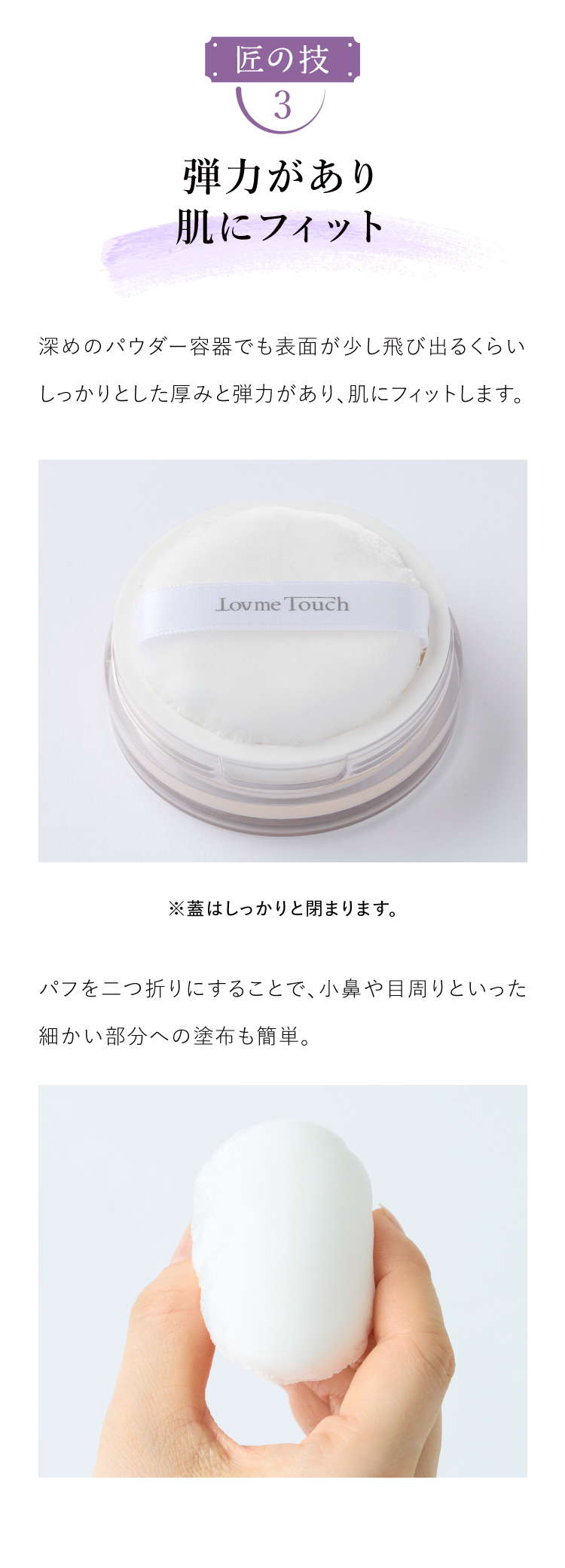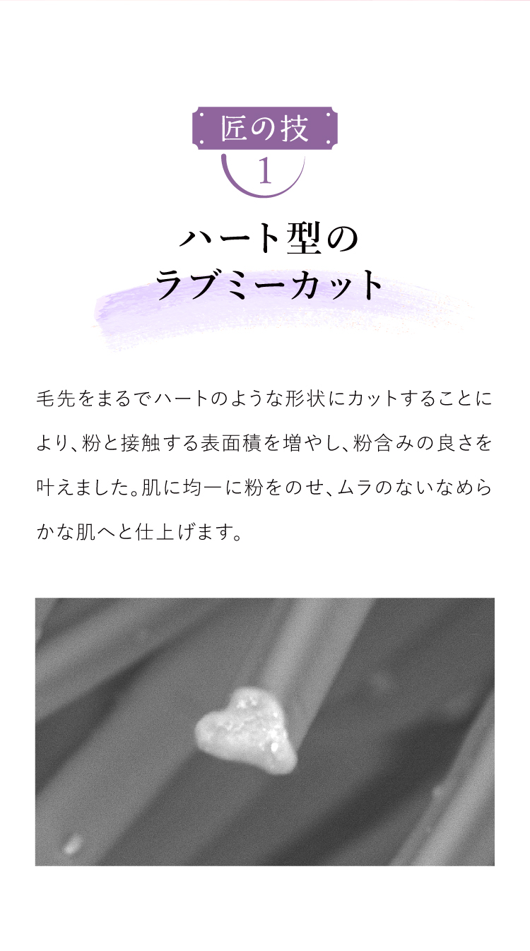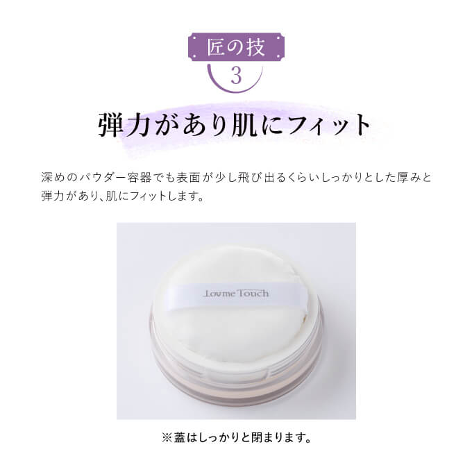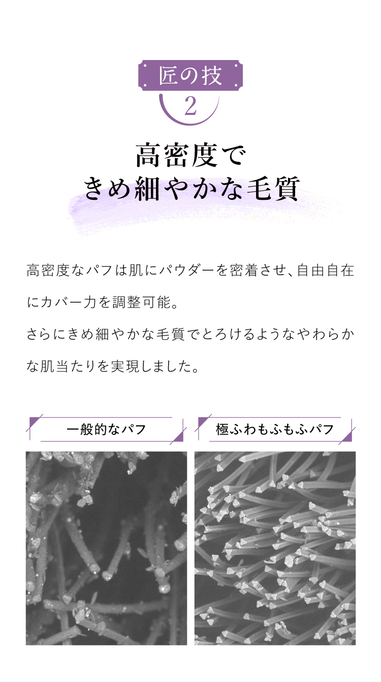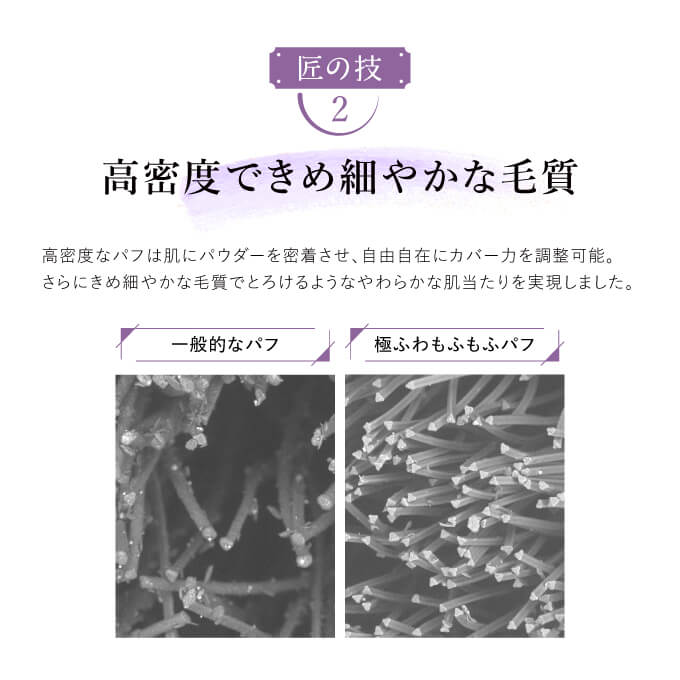 | 特徴 | 粉のプロがしっとりしたパウダーをダマにならず、よれさせずに塗布するために開発した渾身の匠パフ。 とろけるように柔らかな肌あたりで、メイクがよれにくく、きめ細かい均一な肌に仕上げます。 |