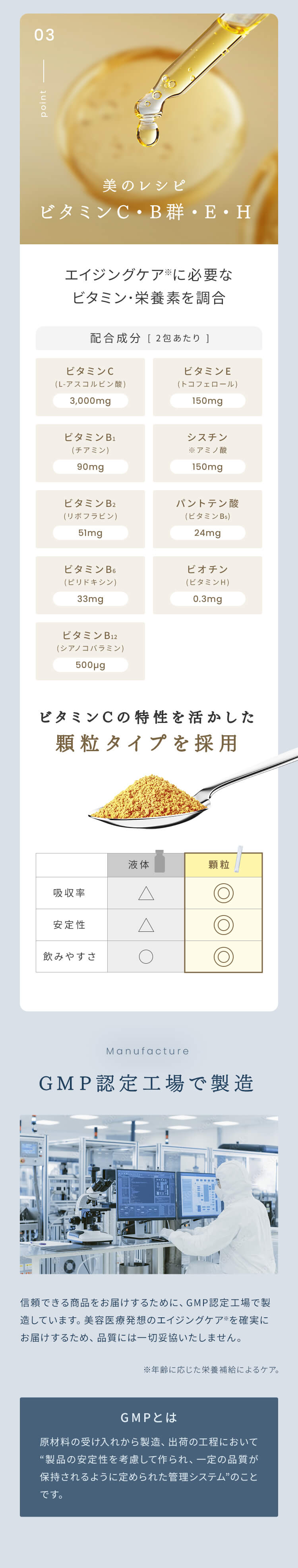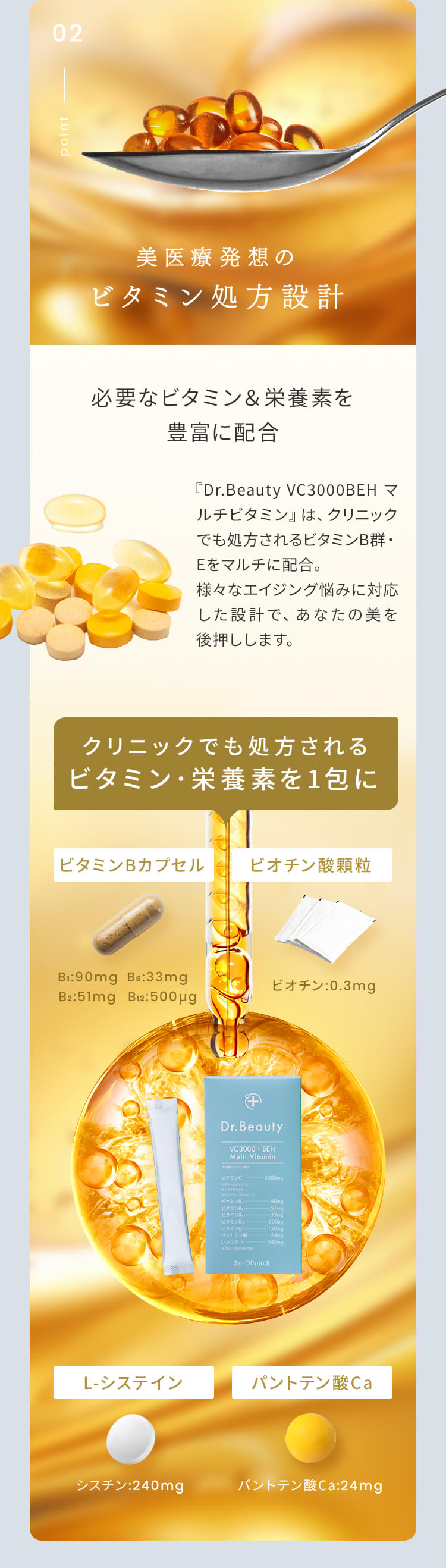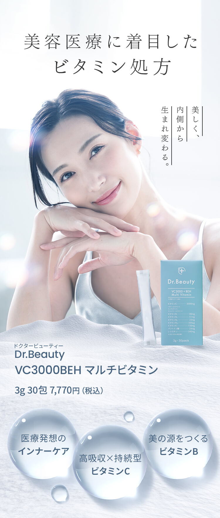特徴 | 01:医療発想のビタミン処方設計 02:独自の高吸収×持続型ビタミンC 03:ビタミン・栄養素の吸収アップ 04:こだわりの剤形 従来のビタミンCサプリメントの課題を解決し、理想の効果を実現する革新的な製品です。 リポソーム化ビタミンC、タイムリリースビタミンCなどを独自の処方設計で配合することで、高い吸収率と吸収持続性を両立しました。 さらに、美容と健康に必要な美容医療機関でも処方されるビタミン・栄養素を配合したマルチビタミンサプリメントです。 |