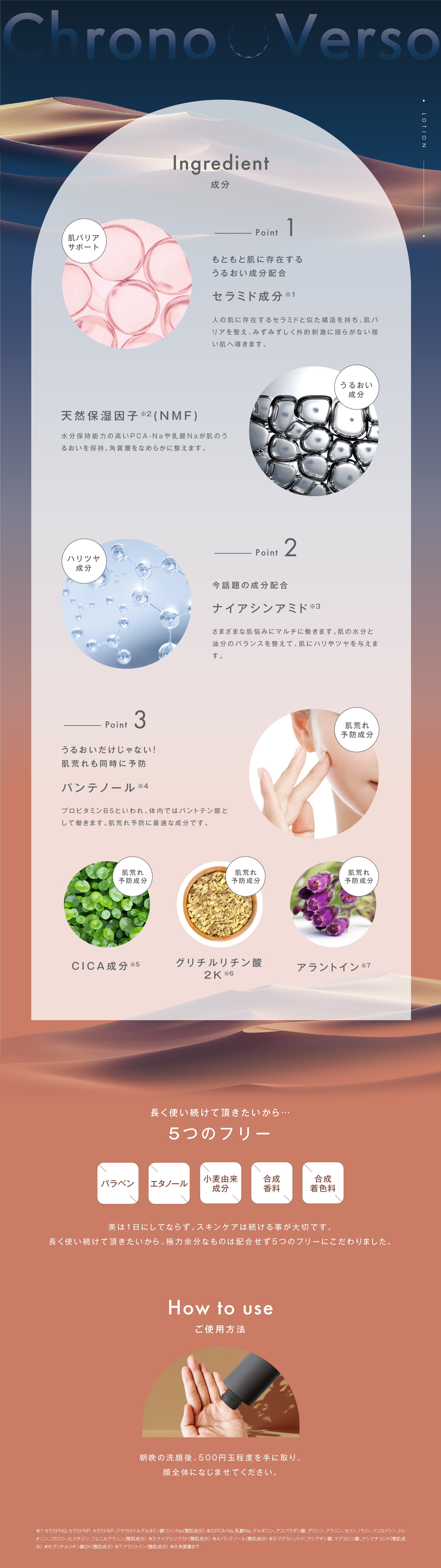| 特徴 | パンテノール※1やセラミド成分※2など肌バリアをサポートし、肌にうるおいを補います。また、グリチルリチン酸2 K ※3やアラントイン※4、C I C A 成分※5が肌荒れや炎症を防ぎ、キメの整ったなめらかな肌へ導きます。さらに、グラブリジン※6やペプチド※7、ナイアシンアミド※8が肌にハリツヤを与え、肌にうるおいをもたらします。 ※1:パンテノール(整肌成分)※2:セラミドNG、セラミドNP、セラミドAP、ジラウロイルグルタミン酸リシンNa(整肌成分)※3:グリチルリチン酸2K(整肌成分)※4:アラントイン(整肌成分)※5:マデカッソシド、アシアチン酸、マデカシン酸、アシアチコシド(整肌成分)※6:グラブリジン(整肌成分)※7:オリゴペプチド-68(整肌成分)※8:ナイアシンアミド(整肌成分) |