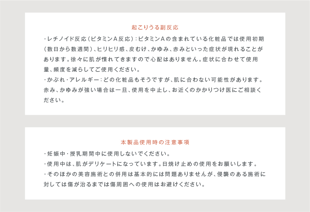 | 特徴 | 3 種のビタミンA ※1~3でハリのあるなめらかな肌へ整えます。また、ビタミンA によるアクティブな反応を抑えるために肌バリアを整えるセラミド成分※4を高濃度※5配合しています。そのほかにも保湿成分や肌荒れを抑える成分を配合し、つややかな肌へ導きます。 ※1:レチノール(整肌成分)※2:パルミチン酸レチノール(整肌成分)※3:リノール酸レチノール(整肌成分)※4:セラミドAP、セラミドEOP、セラミドNP、ジラウロイルグルタミン酸リシンNa、フィトスフィンゴシン(整肌成分)※5:当社比 |